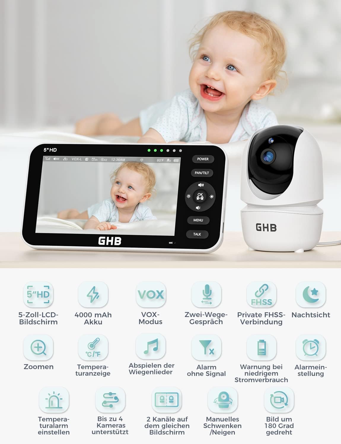 Основні характеристики моделі SM50B: Дисплей: Великий 5-дюймовий HD IPS-екран з роздільною здатністю 720P, що забезпечує чітке зображення та кут огляду майже 180°. Зв'язок: Використовує безпечну технологію 2.4GHz FHSS, яка працює без Wi-Fi та додатків, що гарантує приватність. Дальність дії становить до 270–300 метрів на відкритому просторі. Керування камерою: Дистанційне повертання камери на 350° по горизонталі та 110° по вертикалі, а також цифровий зум (до 4x). Нічне бачення: Автоматичне інфрачервоне нічне бачення дозволяє бачити дитину в повній темряві. Функції: Двосторонній зв'язок (Intercom): Можливість говорити з дитиною через монітор. Режим VOX: Екран автоматично вмикається, коли камера фіксує звук або плач. Датчик температури: Контроль температури в кімнаті малюка з відображенням на моніторі. Колискові: Вбудовані мелодії для заспокоєння дитини. Акумулятор: Батьківський блок має вбудований акумулятор (4000 мАг), що забезпечує до 10-12 годин роботи з увімкненим екраном або до декількох днів у режимі VOX. Камера повинна бути завжди підключена до мережі.